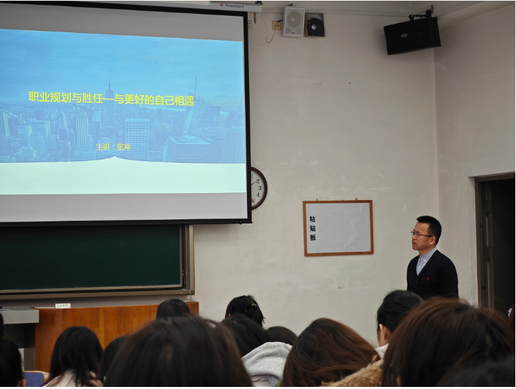 课堂上,张冲从自身经历出发,以多领域、多视角的丰富事例对职业规划进行了详实的介绍,既为同学们讲解了专业的职业规划知识,从“升级认知,刻意练习,复盘反思”到“尽力而为,脱颖而出,做出极致”,从设计职业蓝图到确定职业使命,从制定职业目标到实施职业规划,在问答互动中让同学们思考职业规划与自身就业优势,让同学们意识到自我认识的重要性。